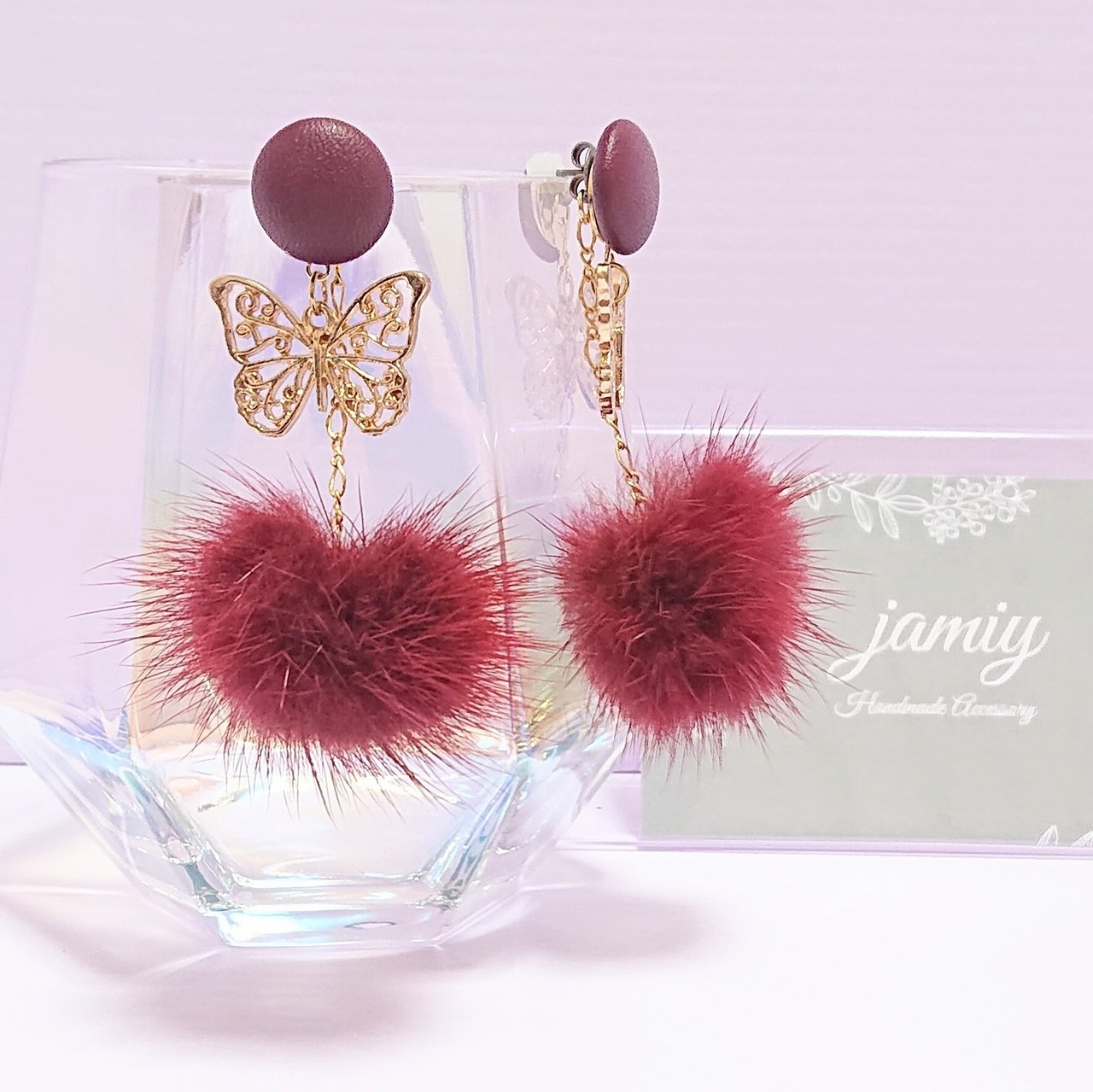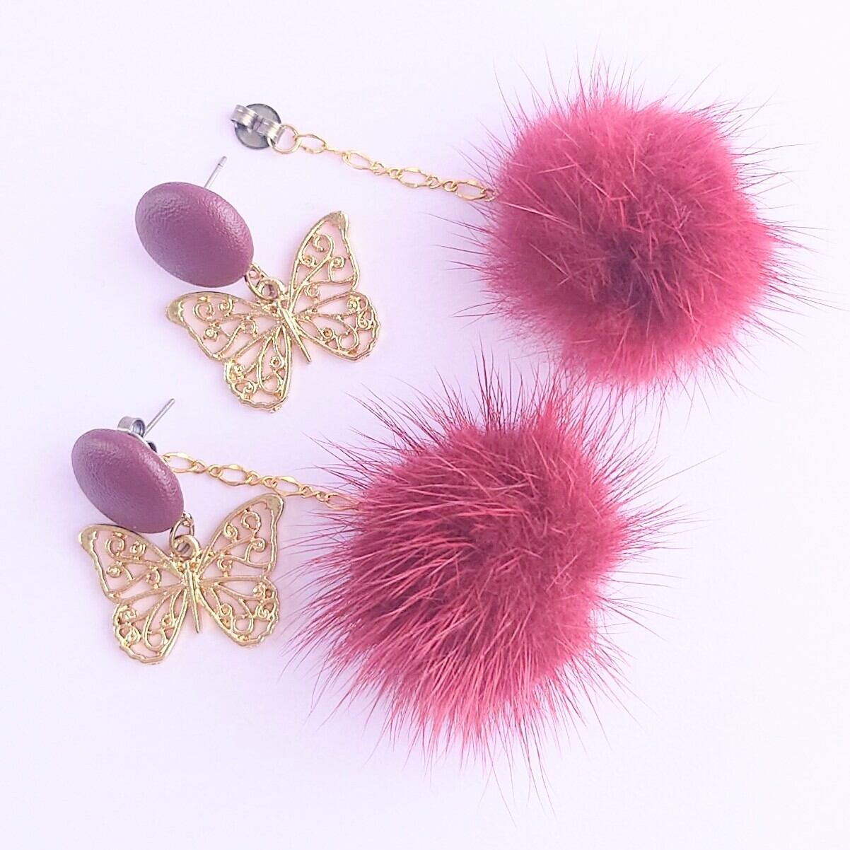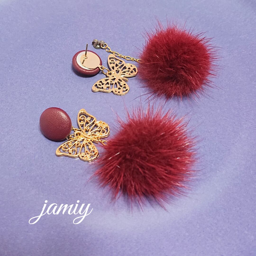 ボルドーのレザー調カボションにすかし蝶がゆれるピアス✨ピアスキャッチにデザインチェーンでボルドーのミンクファーがゆれるフワフワピアス✨