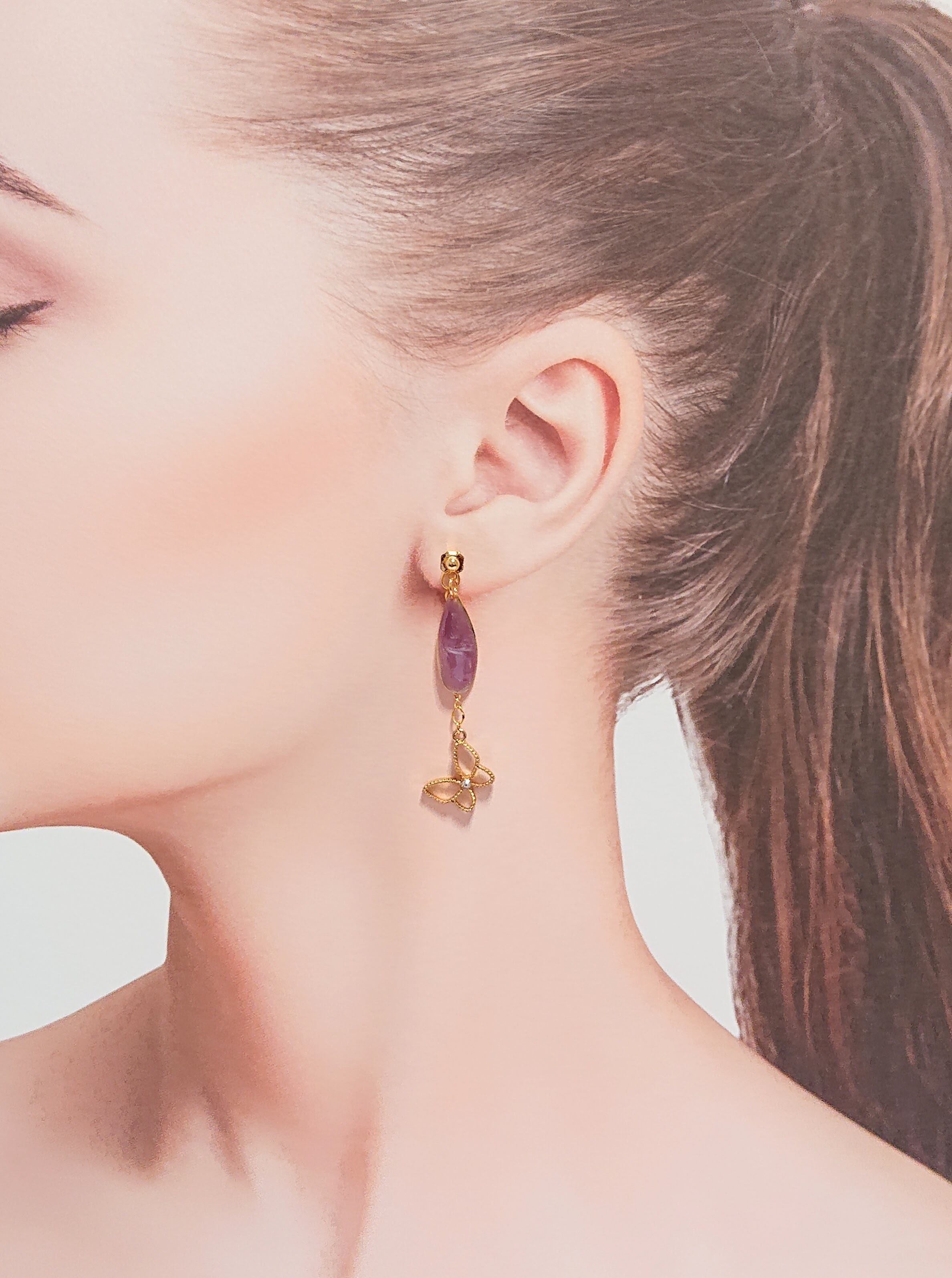ピンクの花びらチャームにピアスキャッチにデザインチェーンで蝶のチャームがゆれるピアス♡