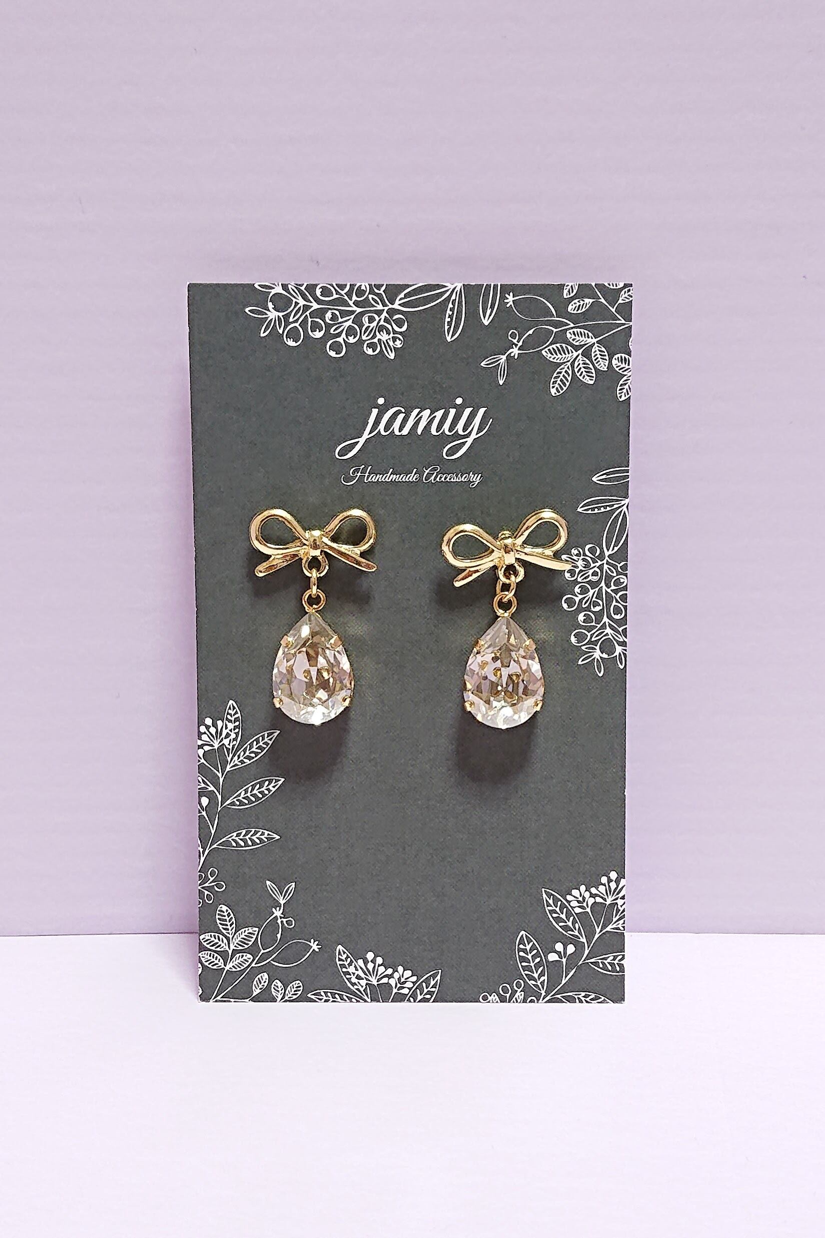 リボンにしずくのクリスタルがゆれるキラキラピアス♡