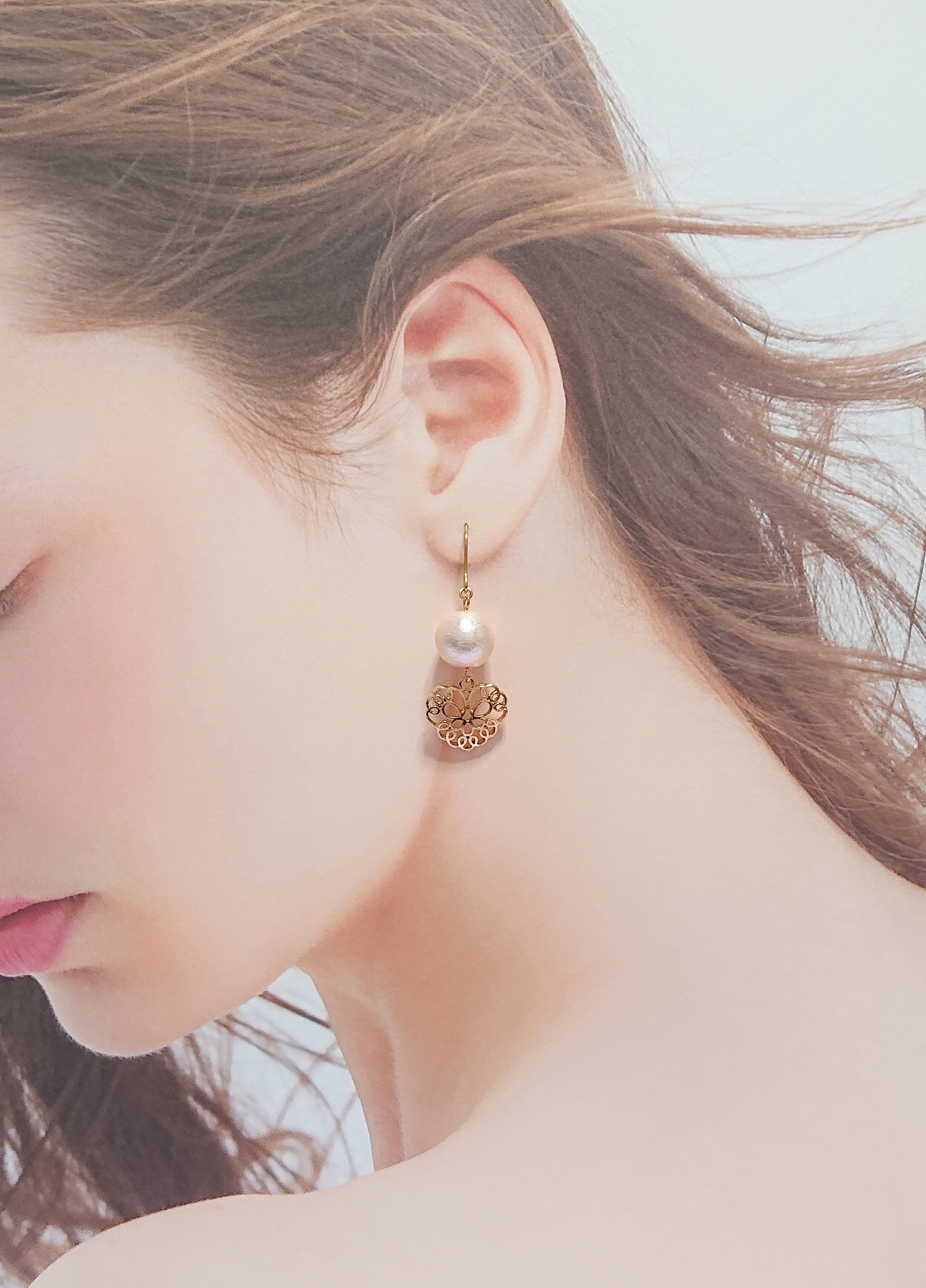 淡いピンクのコットンパールにすかしハートのゆれる大人可愛いピアス♡