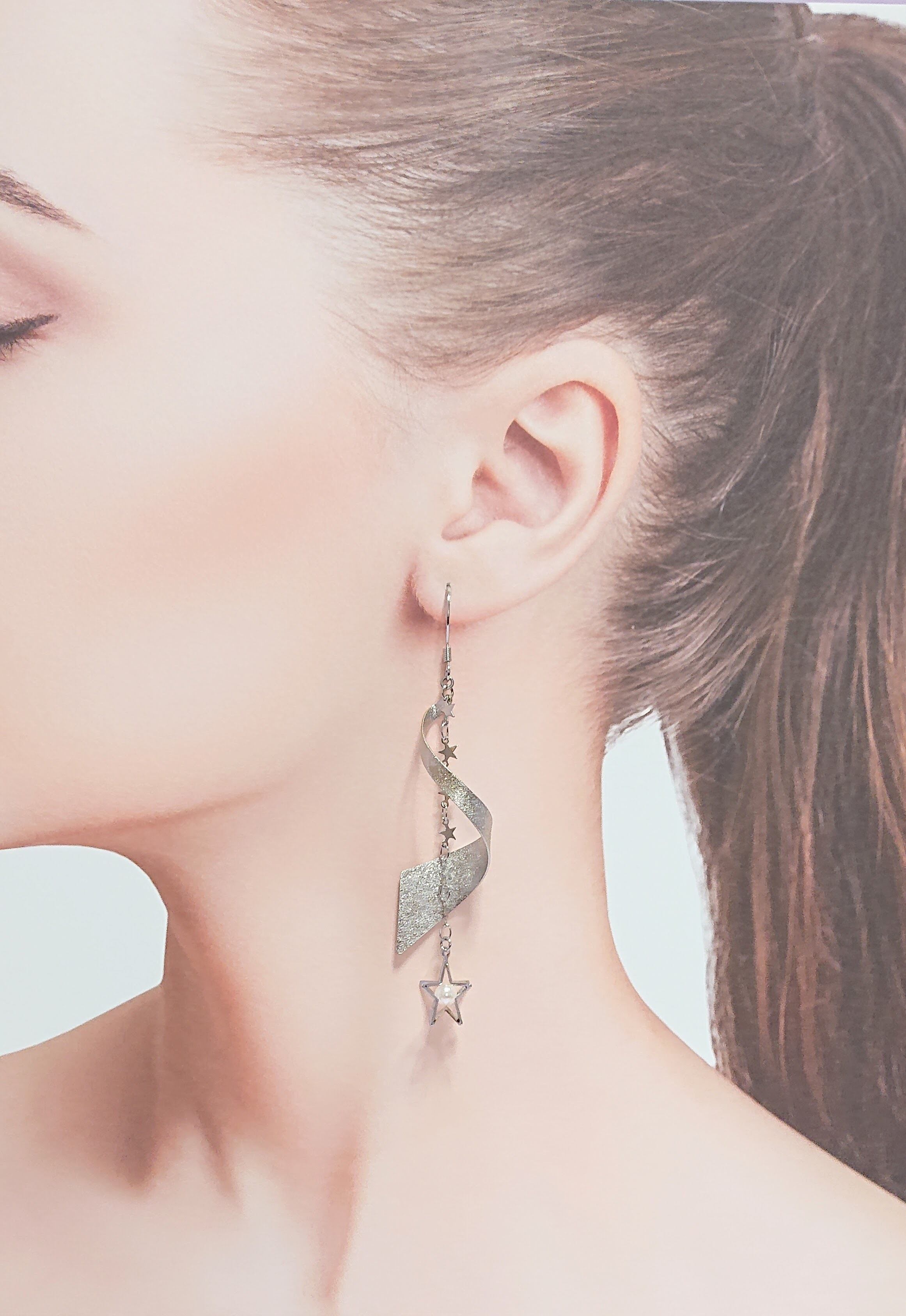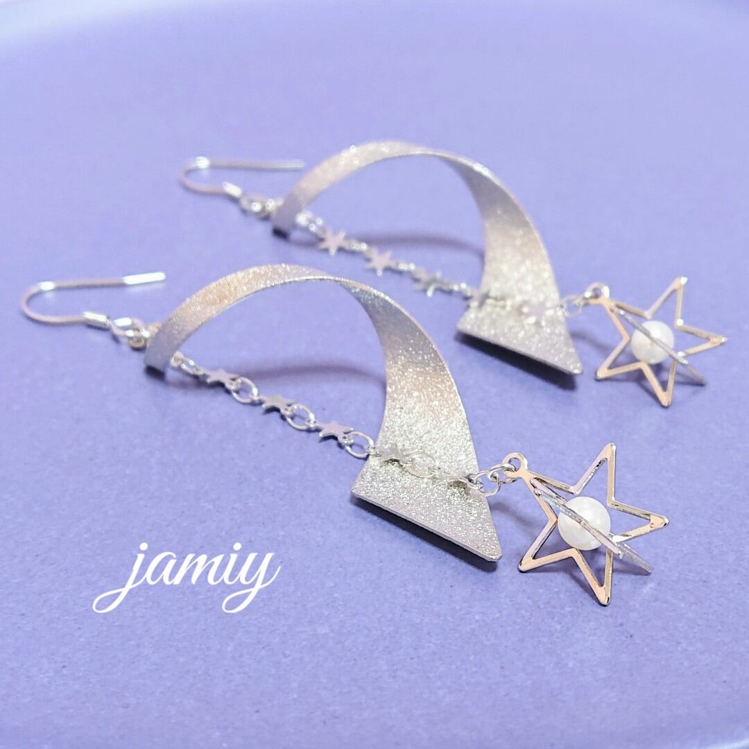 表面にスターダスト加工が施された螺旋状のメタルパーツに、星のチェーンにパールが入った立体的な星のパーツをあわせて長さのある流れ星のようなイメージのゆれるピアス☆
