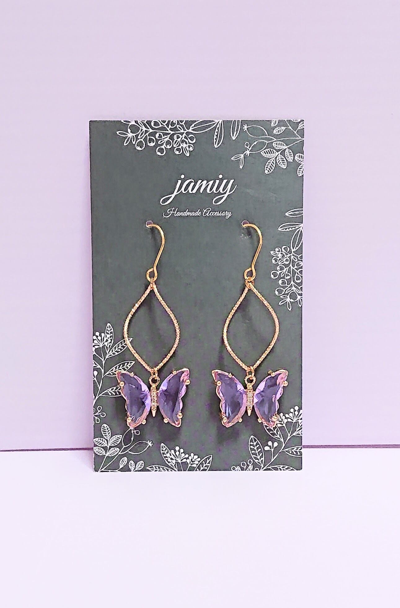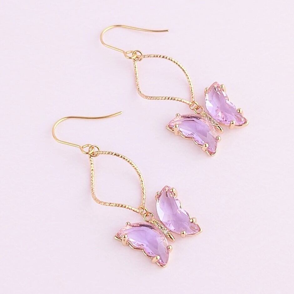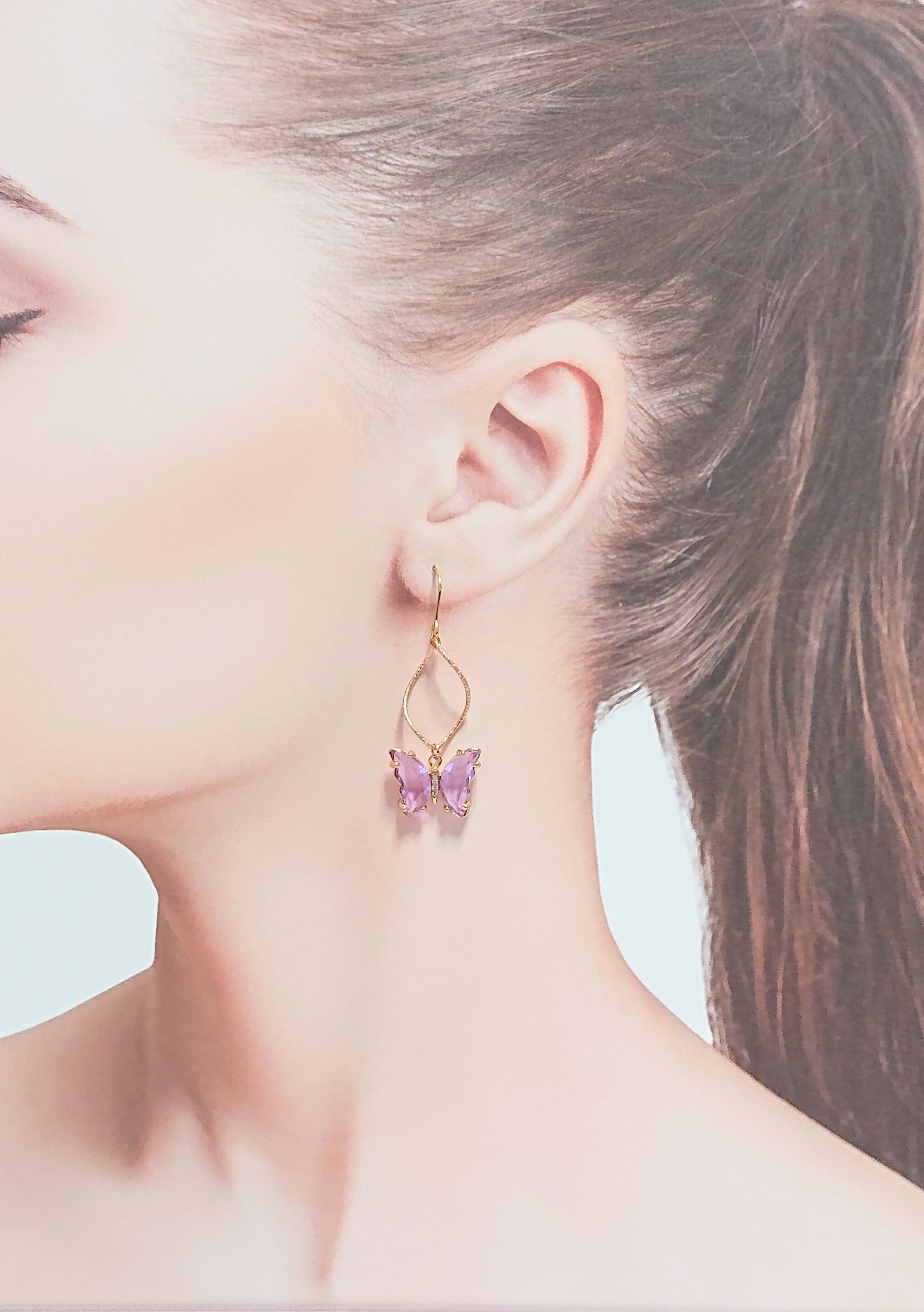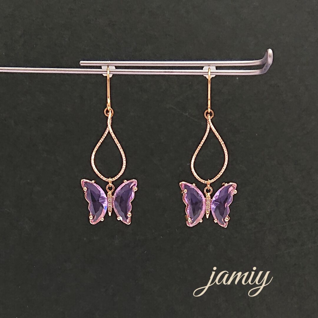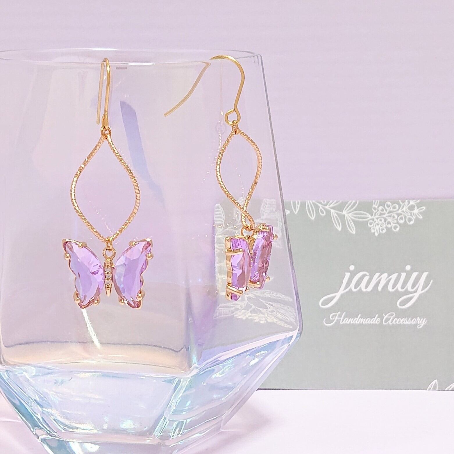 ツイストループにパープルのガラス蝶チャームがゆれるピアス♡
