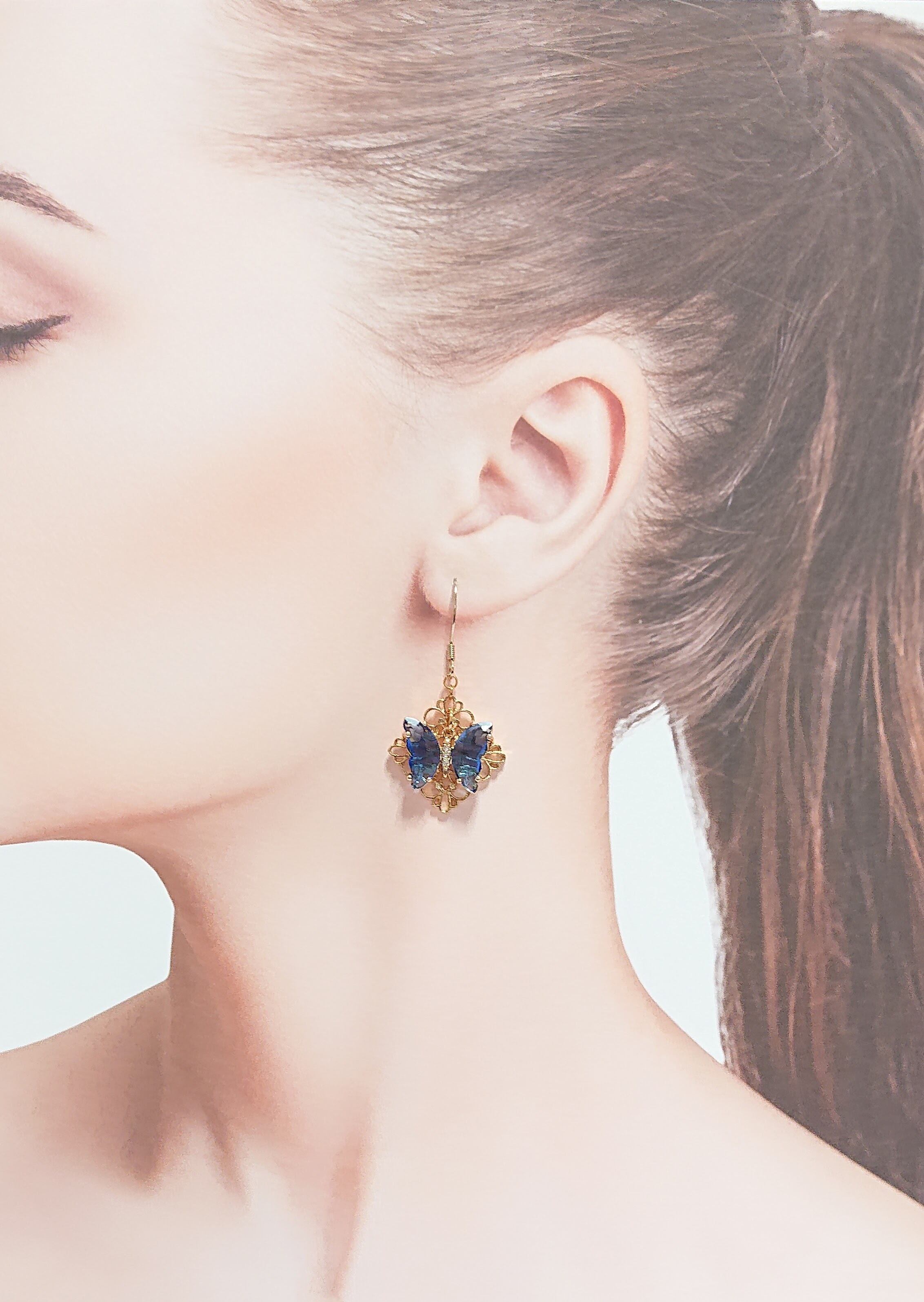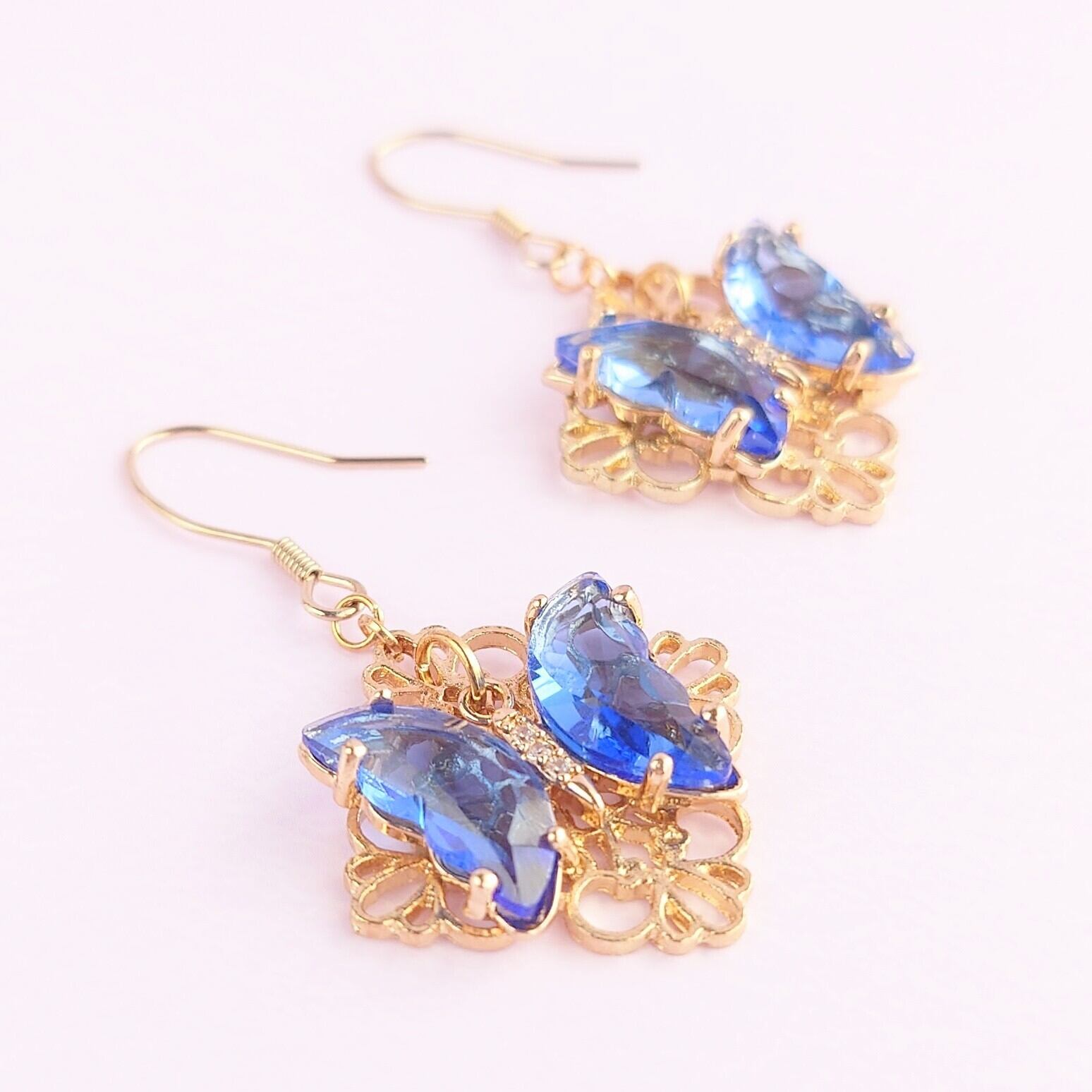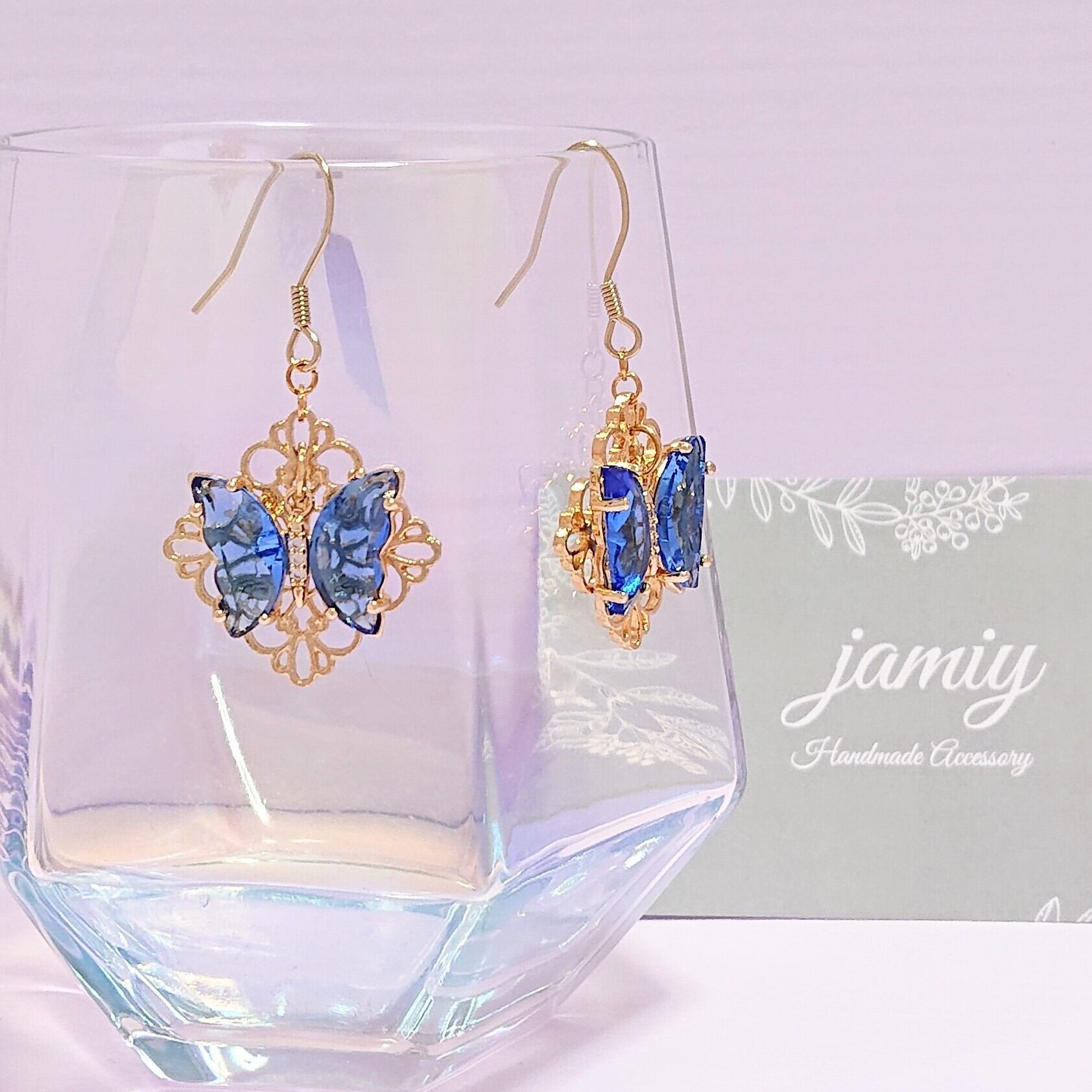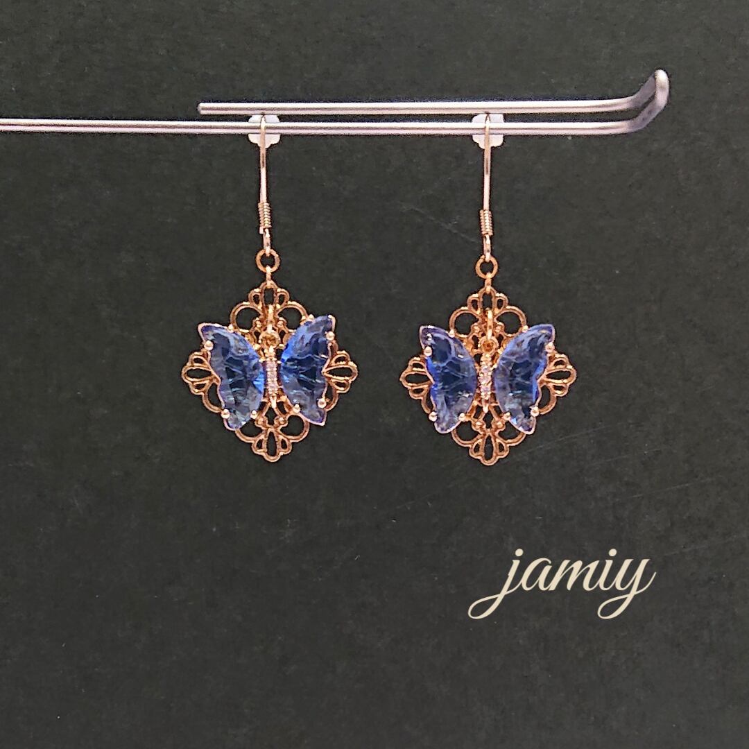 ひし形のすかしパーツにブルーのガラス蝶がゆれるピアス♡