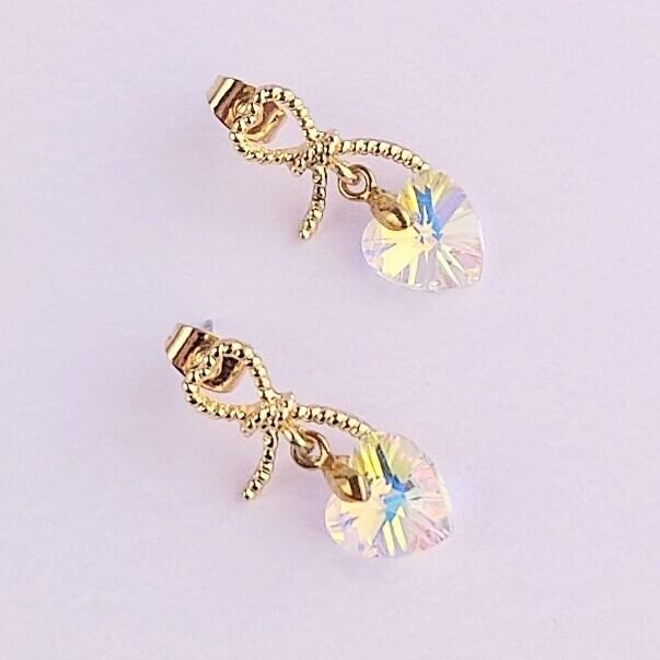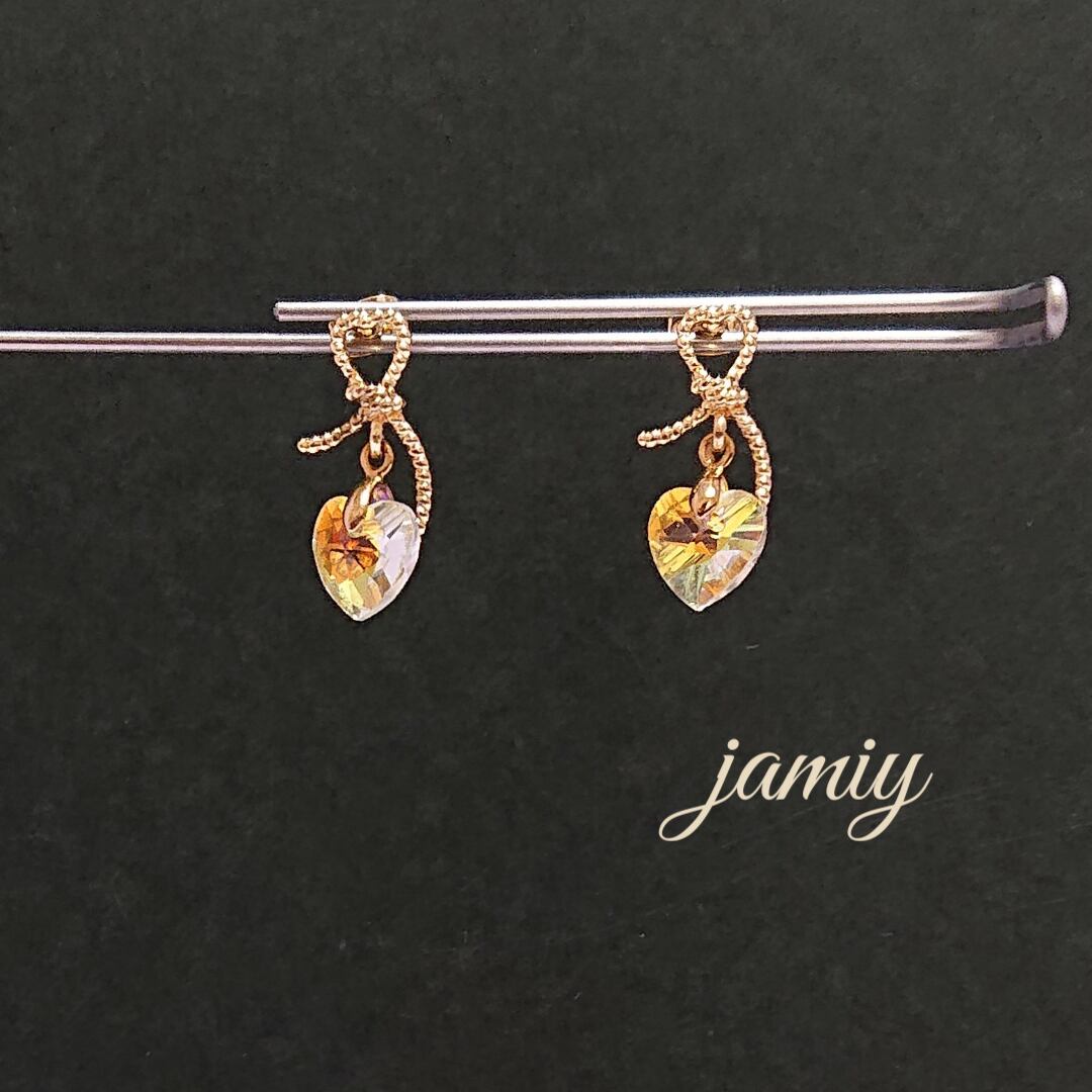 ハートリボンのピアスにガラスのハートがゆれるピアス♡