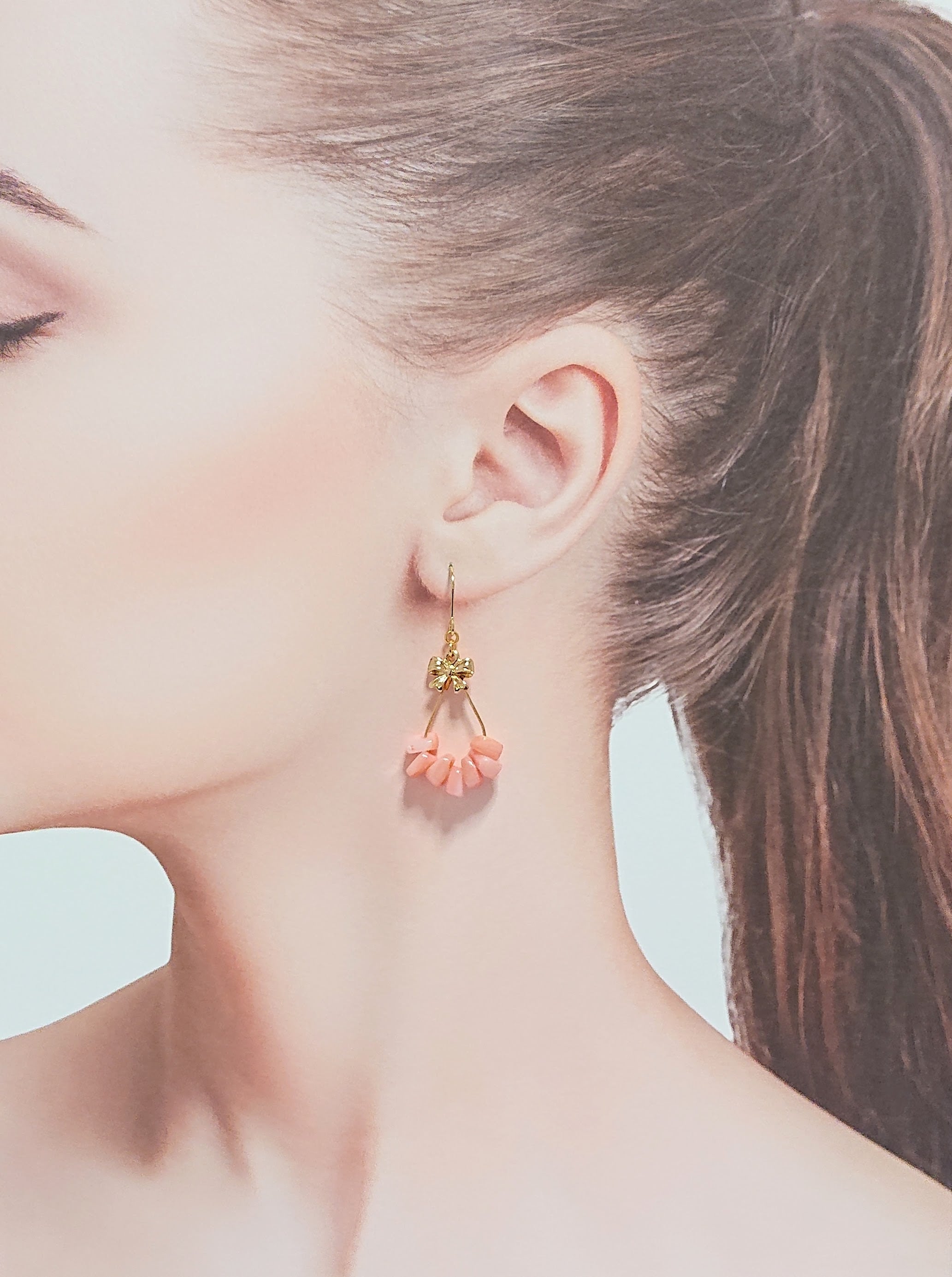 しずくフープにピンクのシェルビーズとリボンがゆれるピアス♡