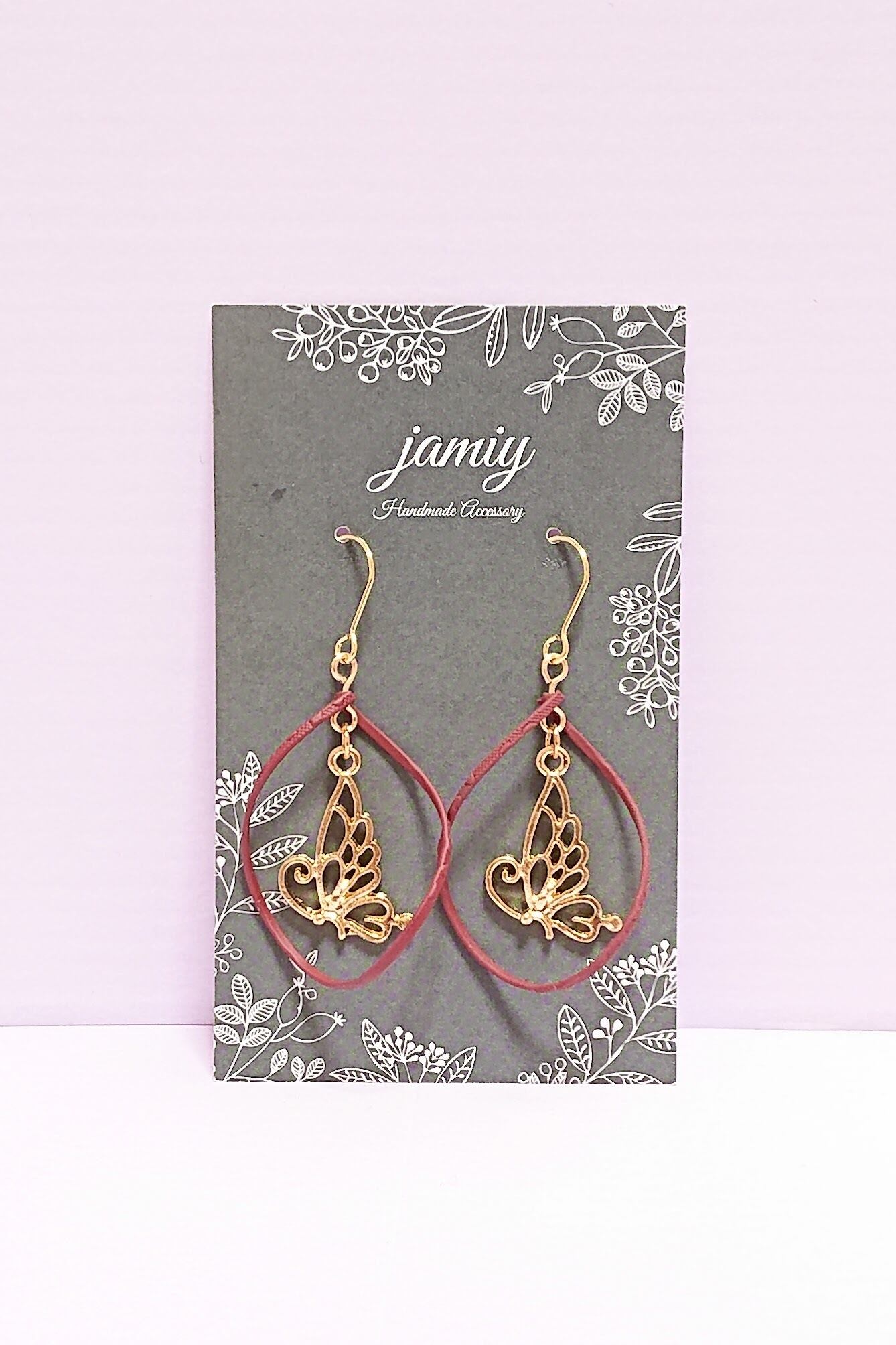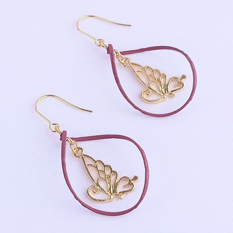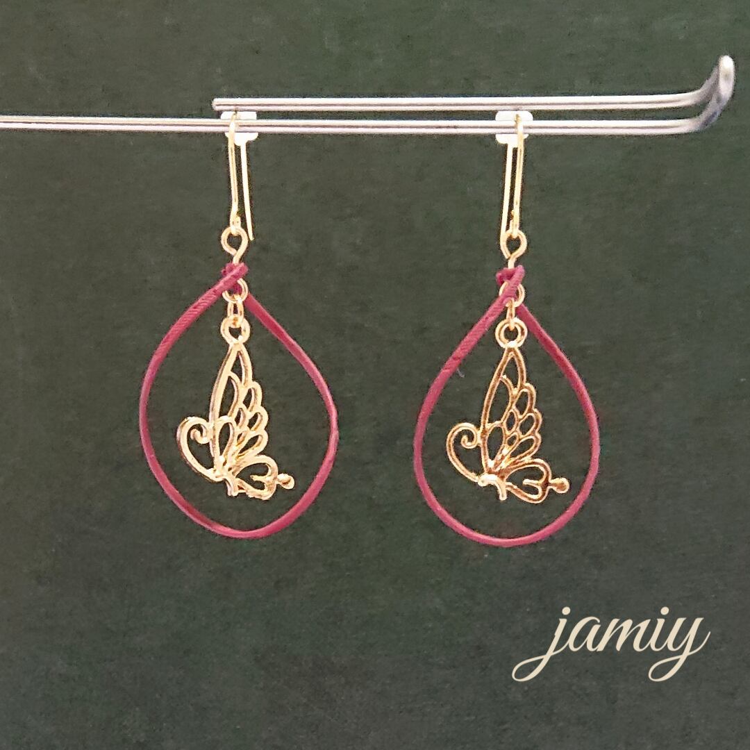 ボルドーのマッドカラー加工してあるツイストフープの中に蝶がゆれるピアス♡