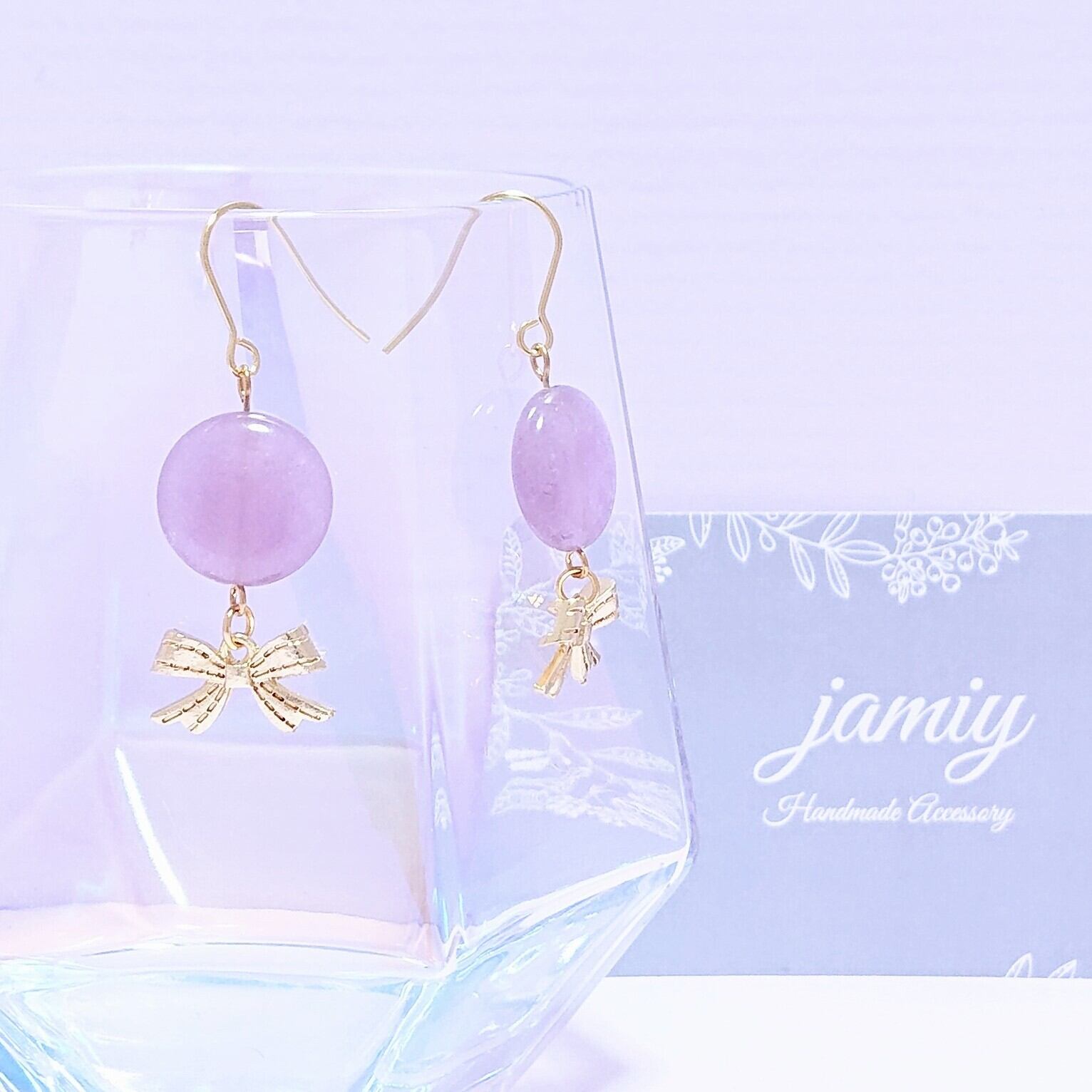 パープルの翡翠コインビーズにリボンチャームのゆれるピアス♡