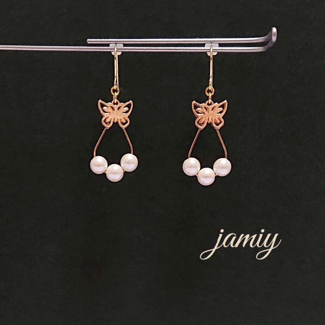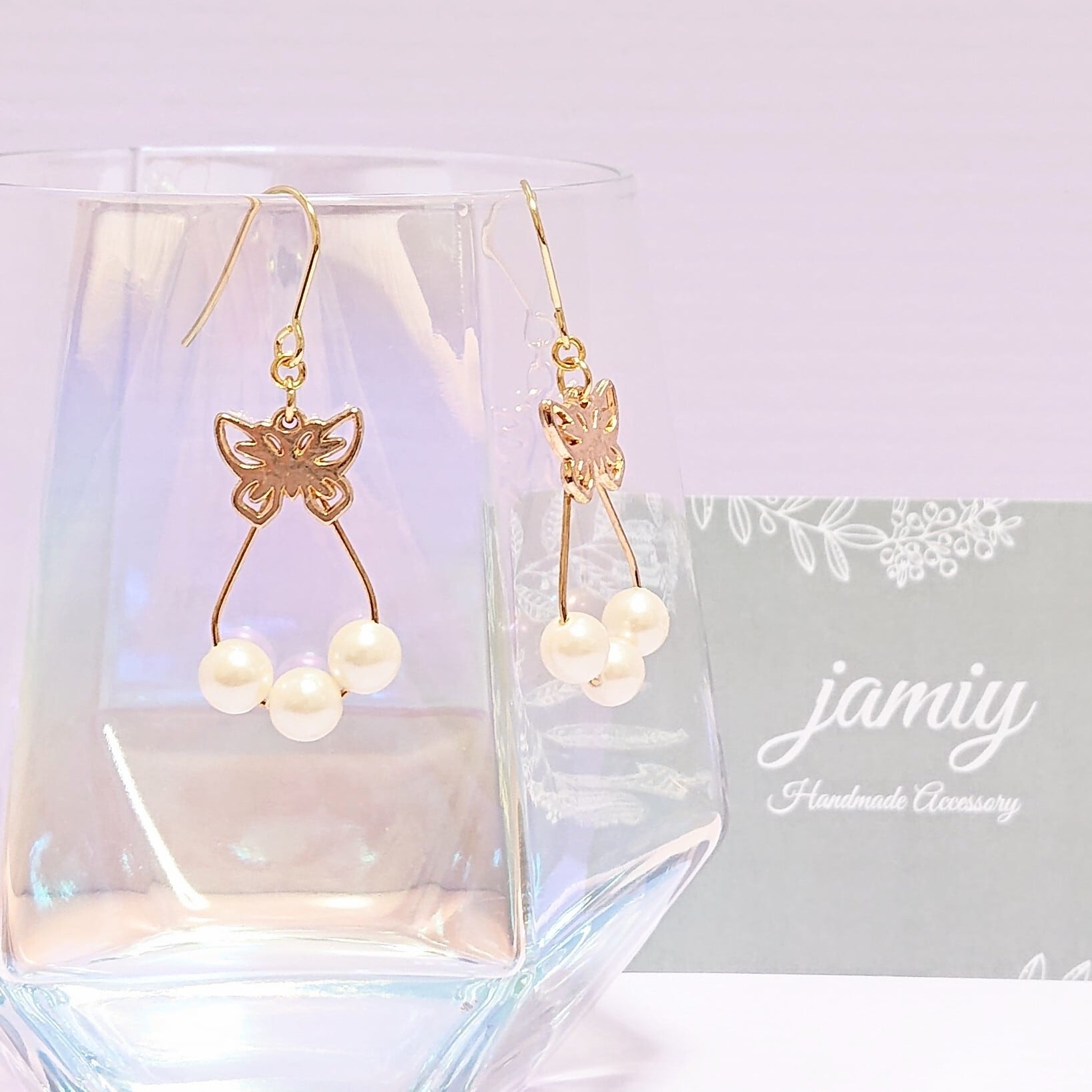 気品と可愛さを兼ね備えた、蝶とパールのゆれるピアス♡