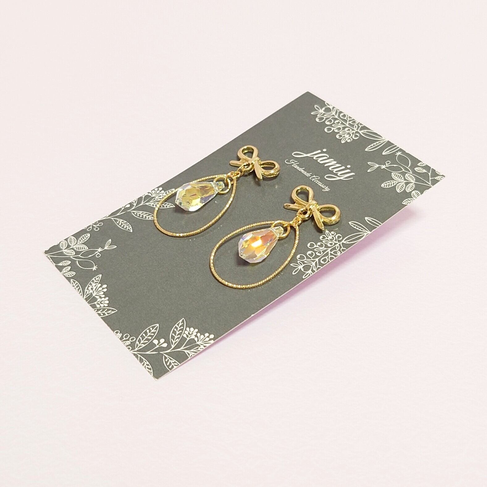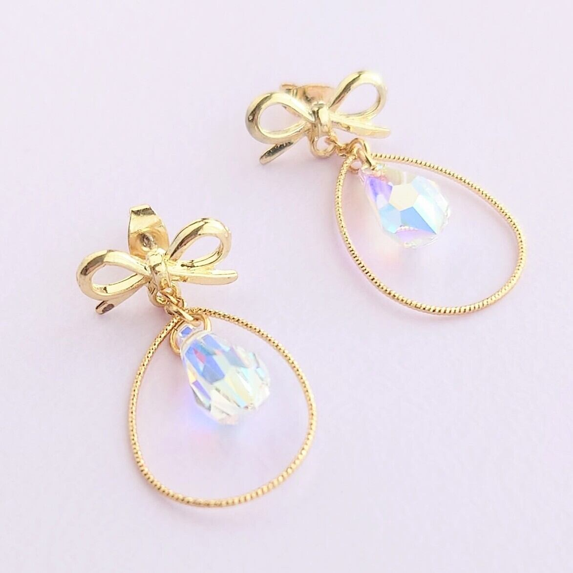 輝くクリスタルがゆれるリボンピアス♡